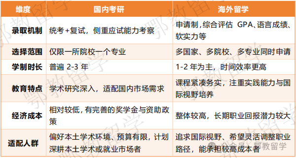 双轨策略赋予考生更灵活的决策空间:若考研顺利上岸,可结合国内院校资源与职业规划,在本土深造与海外求学间做最优选择;若对本科专业不满,留学能提供便捷的转专业路径,拓宽职业边界;即便留学遭遇签证、预算等问题,考研准备也为国内升学保留了退路,彻底告别“空档期”的焦虑。