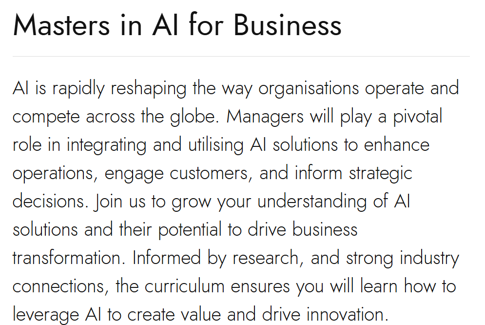聚焦培养 “懂 AI 的商业领袖”,提升学生整合 AI 解决方案、推动企业 AI 转型的核心能力,课程与市场岗位需求高度适配。