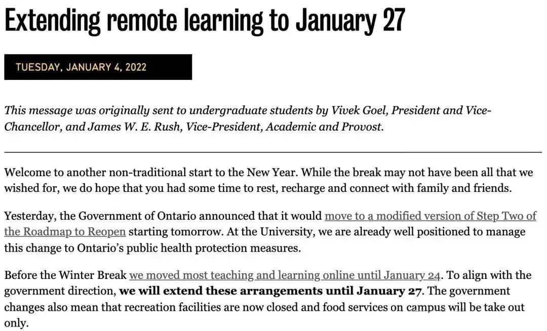 滑铁卢大学近日宣布,原定于持续到1月24日的线上授课,再延期至1月27日。
