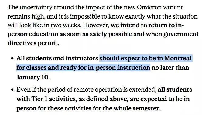 校方表示,无论是否恢复线下教学,所有学生都必须在1月10日前返回蒙特利尔,为校园重启做好准备。
